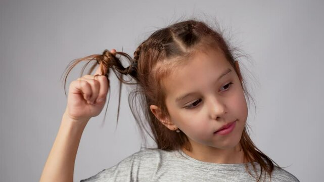 Cute girl twirling her hair around her fingers and thinking with smile on her face