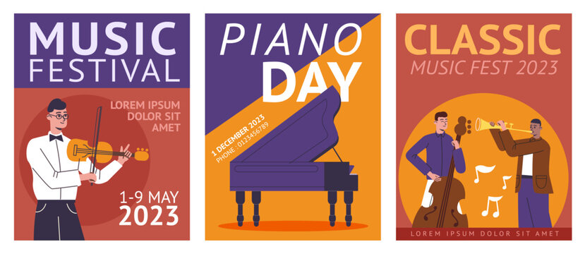 Classic music concert posters. String and wind instruments. Musicians characters. Invitational banners. Symphony orchestra. Acoustic performance. Vector musical festival cards design set