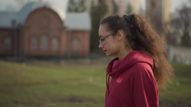 Girl In Open Field Turns Head Thoughtfully, Teenage Girl With Glasses Surveys Expansive Landscape Curiously, Young Girl With Tousled Hair And Glasses Examines Open Area With Wonder