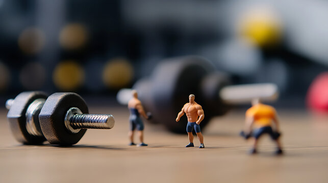 Tiny bodybuilders work out with nuts and bolts in the gym, showcasing a humorous twist on fitness and miniature photography. Macro shot of weights and trainers.
