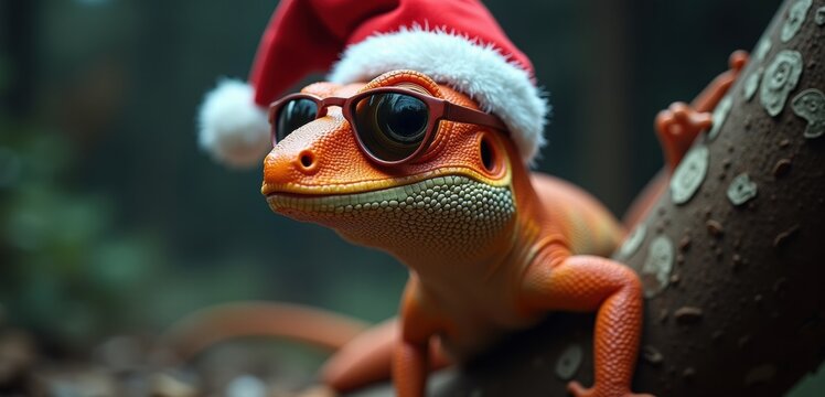 This festive gecko, donning a Santa hat and sunglasses, brings a playful twist to holiday themes, perfect for marketing materials or fun seasonal promotions.