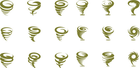 Set of various green tornado and twister vector illustrations on a white background for design elements.