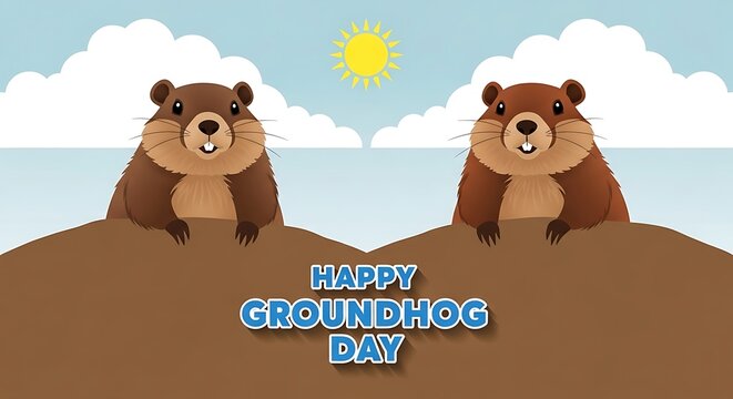 Cheerful groundhog day illustration featuring two cute groundhogs emerging from their burrows, set against a sunny sky with the text happy groundhog day