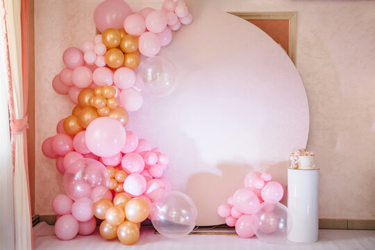 Arch decorated with pink, white and golden balloons. Trendy baptism cake for girl. Delicious reception at a birthday party. Photo wall decoration space or place for text. Celebration concept.