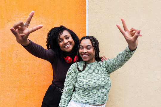 Happy friends gesturing peace sign in front of wall