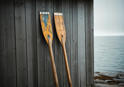 Closeup of two wooden oars on the dock.