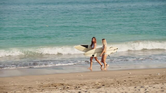 Two modern young adult female surfers wearing bikinis walking along ocean coast holding surfboards