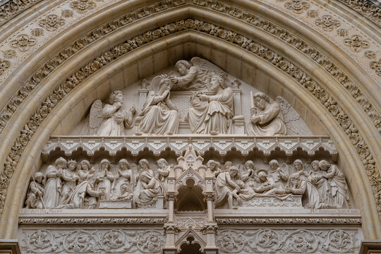 Closeup view of the tympanum showing the coronation of the Virgin Mary above the east entrance to ancient St Pierre or St Peter cathedral, tourism landmark of Montpellier, France
