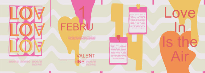 Valentine day modern banner with trendy minimalist typography design. Poster templates with heart symbols dripping and melting, love quotes and text elements for invitation. Vector illustration.