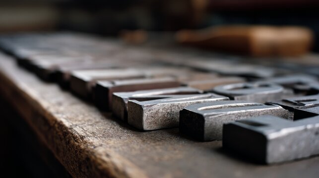Close-up of metal letterpress type on a wooden table, revealing the beauty of traditional printing techniques.