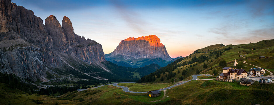 View from Campolognopass to tourist resort Corvara, Alta Badia, south tyrol