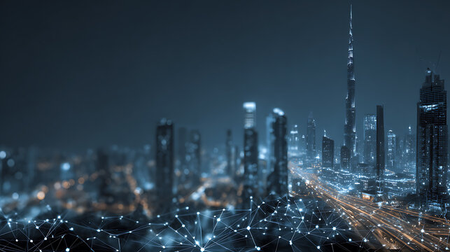 Dubai cityscape at night with network connection lines and futuristic technology concept design effect