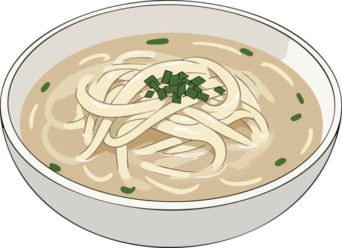 Bowl of udon noodles in a light beige broth, garnished with green onions.