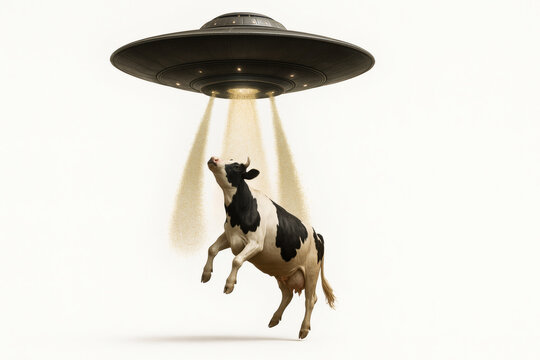 Cow being abducted by UFO alien spaceship with glowing beams, white background