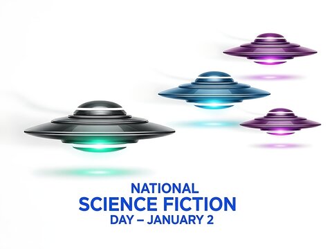 National science fiction day illustration with colorful ufos on white background