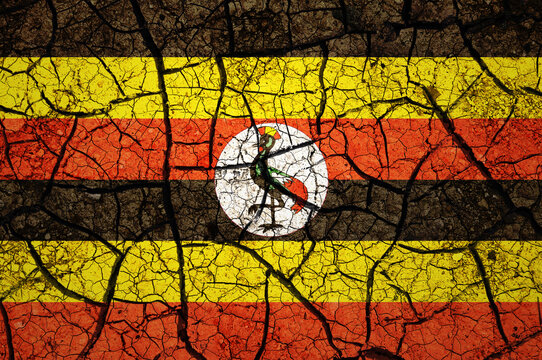 Dry soil pattern on the flag of Uganda. Country with drought concept. Water problem. Dry cracked earth country.
