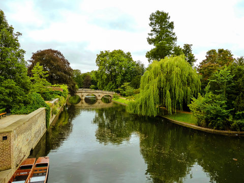 View of a bridge on the river Cam and the park at the University of Cambridge