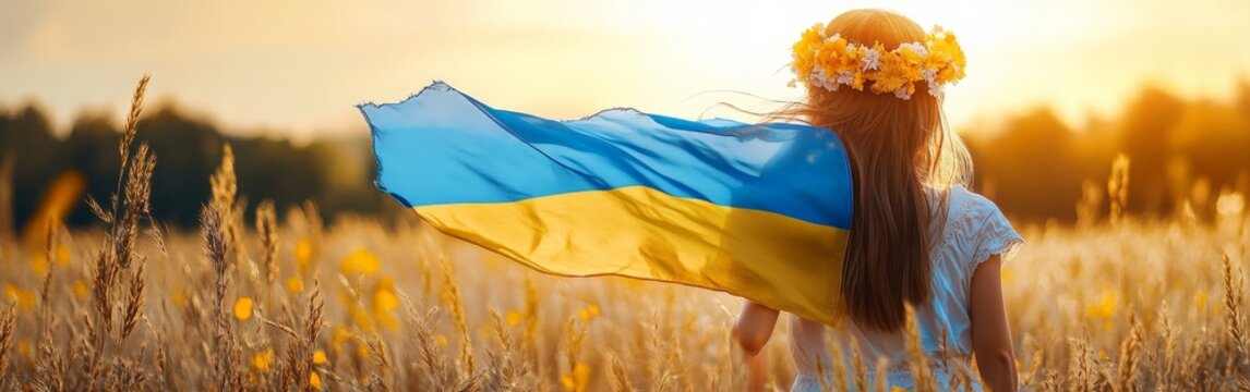 Girl carrying fluttering Ukrainian flag in a sunlit field