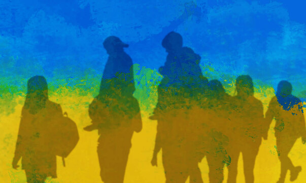 Double exposure of Ukrainian flag and silhouettes of refugees