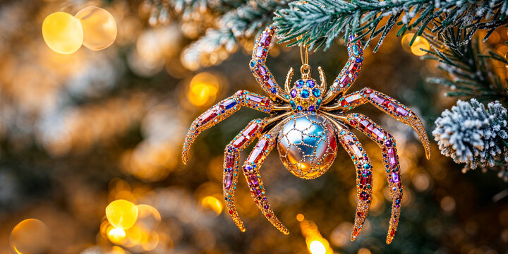 Jeweled spider ornament hanging from tree, Legend of the Christmas Spider folktale, copyspace