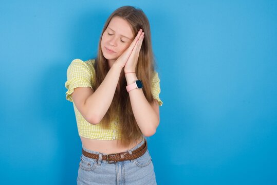 Relax and sleep time. Tired young ukranian girl wearing yellow t-shirt over blue backaground with closed eyes leaning on palms making sleeping gesture.
