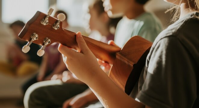 Little girl playing ukulele and smiling during music lesson at kindergarten