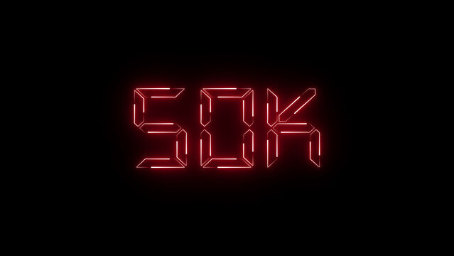 A bold neon "50K" text icon glowing in intense electric colors, symbolizing peak endurance, victory, and celebration—perfect for ultramarathon goals, fitness events, or digital milestones.