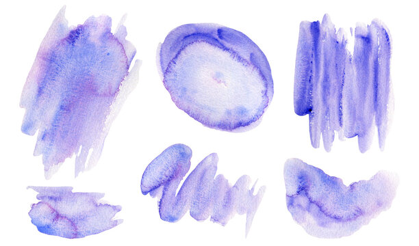 Abstract set of artistic granulate light purple and blue gradient watercolor liquid stains. Vibrant hand painted bright ultramarine violet textured watercolour blobs for banner design, poster