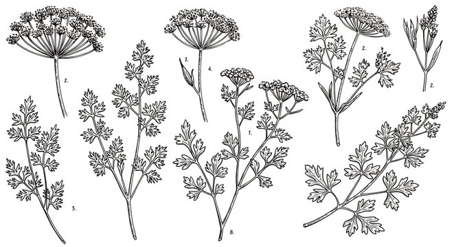 繊細な線画 パセリ植物図鑑 精緻な描写 白黒イラスト. AI Generated