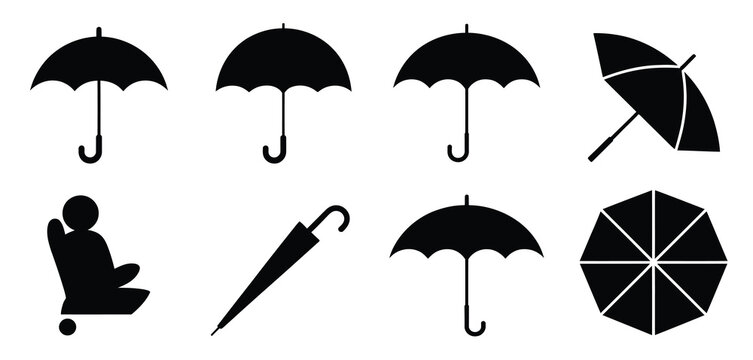 Collection of black umbrella silhouettes in various open and closed positions and a person sitting