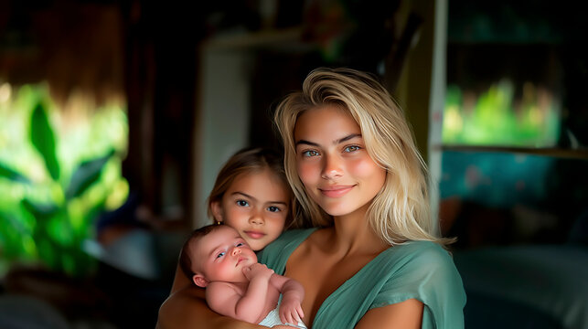 Una madre joven sostiene con ternura a su bebé mientras su hija mayor permanece cerca, creando una imagen llena de amor, calidez y unidad familiar