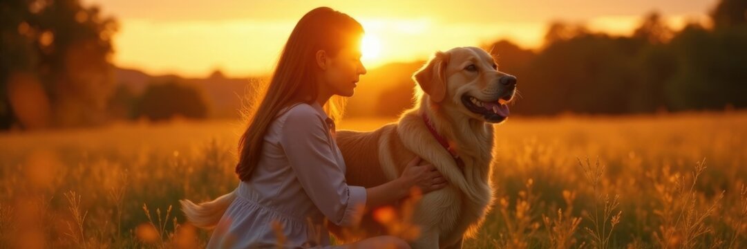 Un cachorro de golden retriever grande y amigable ladeado sobre una joven mujer con cabello largo en el campo al atardecer, sunset, cachorro feliz