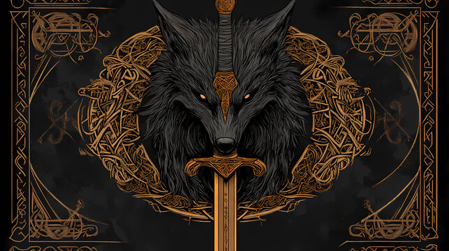 In modern illustrations pagan norse design with raven sword and runes on a black background. Fenrir. Illustration