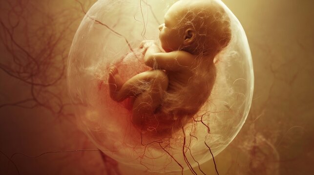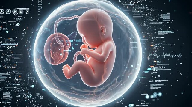 A Glimpse of Life's Beginning: An unborn child floats serenely in its protective embrace, within the nurturing environment of the womb, with advanced digital renderings charting early development.