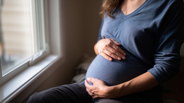 Close view of pregnant belly cradled by hands beside window. Pregnancy, maternal love and emotional bond with unborn baby