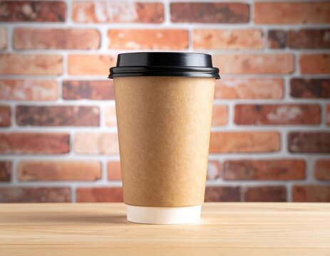 Blank paper coffee cup with black lid on wooden table against rustic brick wall background for branding or design presentation mockup template.