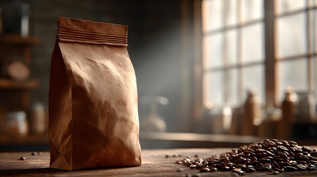 A rustic unbranded brown paper coffee bag with a sealed top standing beside a pile of fresh roasted coffee beans.