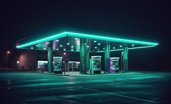 Horizontal shot of a generic unbranded gas station at night with copy space at the top and bottom. created with Generative AI technology