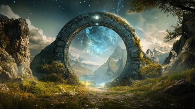 A fantastic landscape where a stargate opens to uncharted territories, with a banner template for copy