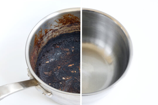 Compare burnt pan before and after cleaning the unclean able stained pot from burnt cookin. The dirty stainless steel pan with the clean pan clean shiny bright like new.