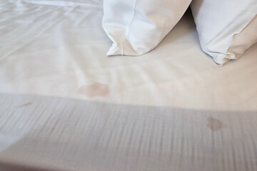 Dirty stained linen bedsheet in hotel room due to lack of quality control over cleanliness.