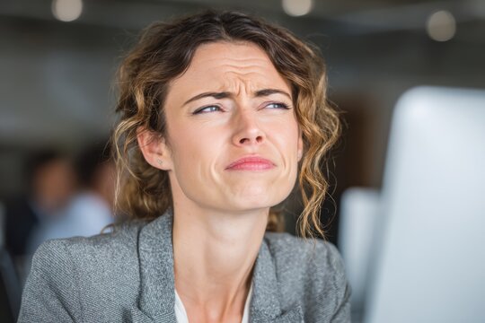 Businesswoman squinting at a screen with mild confusion, showing focus and irritation at unclear data.