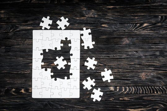 Close-up of unfinished white jigsaw puzzle, single piece absent on black background, missing piece, uncompleted