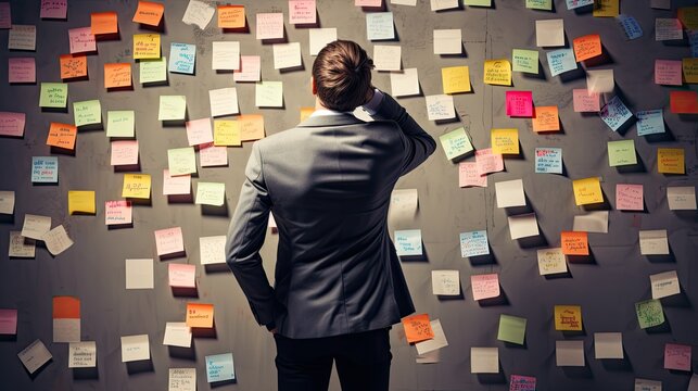A young man in a business suit stands with his back to a wall hung with colorful stickers with uncompleted tasks.