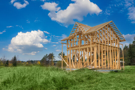 Frame of a cottage under construction against a beautiful sky. Construction of a private house in the countryside. Wooden country house under construction. Rural properties. New country houses.