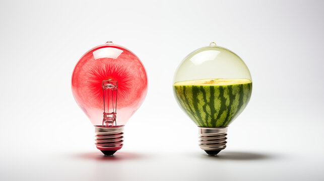 Two lightbulbs, one filled with red watermelon pulp and other with green rind, symbolizing innovative and fresh ideas. Sustainable and organic approach to energy and ideas. Creative lightbulb concept.