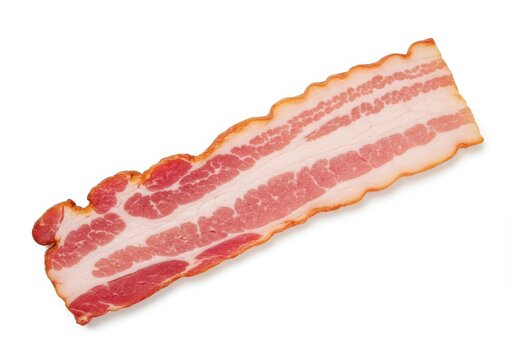 A single uncooked bacon strip with visible fat marbling isolated on a plain white surface background