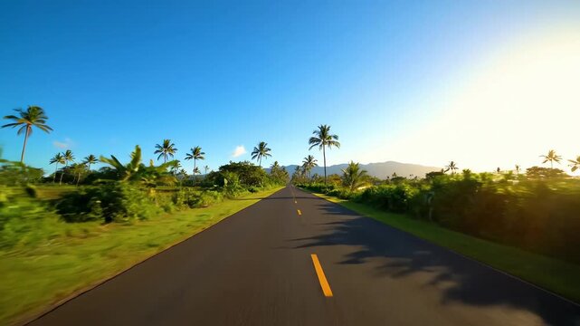 A scenic first-person view driving on a tropical road lined with palm trees under a clear blue sky and bright sun.