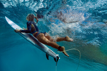 Dark blue ocean surface seen from underwater. Abstract Fractal waves underwater and rays of sunlight shining through
