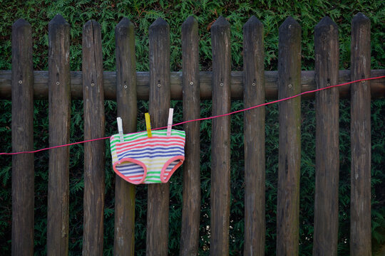 Colorful underpants drying on clothesline in front of wooden fence